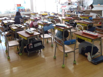 小学1年生は、音楽の授業でした。放送が入り、先生が「どがんせなんと」という声に反応し、机で頭を隠す第一避難行動に気づき、机の下に隠れました。