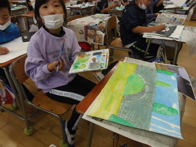 4年生も絵を描いていました。見学旅行の通潤橋の絵を描いていました。