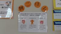 ↓ 給食室の横の多目的ホールに「はやね、はやおき、あさごはん」の大切さをまとめたカードが掲示されています。生活リズムを作ることは、とても大切なことですね。