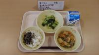↓ 今日の給食は、麦ごはん、いりどり、サラダ玉のごま酢和え、牛乳です。エネルギーは、小学校590Kcal、中学校722Kcalです。