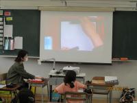 ↓ 4年生の音楽の授業です。中学校の林先生が、4年生に発声の仕方について指導されています。自作の人形を使い腹式呼吸の大切さを説明されていました。説明を聞いた後は、発声練習できれいな声が出るように練習しました。