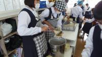 ↓ 5年生の家庭科の授業の様子です。中学校の鎌田先生が授業をされています。前回行った調理実習の反省をされていました。