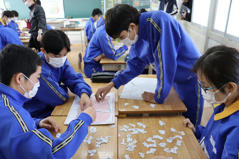 今日は中学3年生の社会の授業に校長先生がゲストティーチャーとして参加されました。なんと、校長先生手作りの「豊野町ふるさとパズル」を使って、豊野町の歴史や地名などについて教えてくださいました。