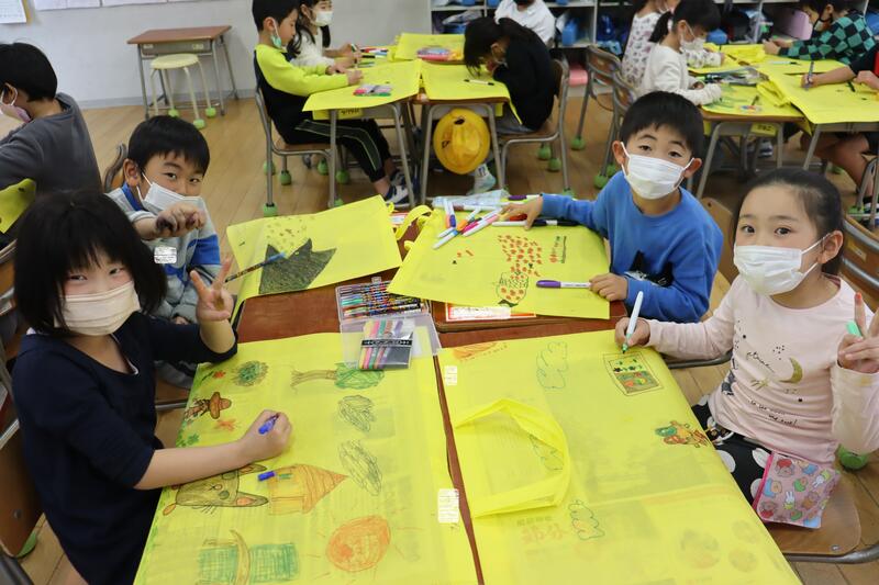 小学1年生は、作品を入れるバッグに絵を描いていました。もう1年間の作品を整理する時期なのですね。早いものです。みんな上手に描いています!