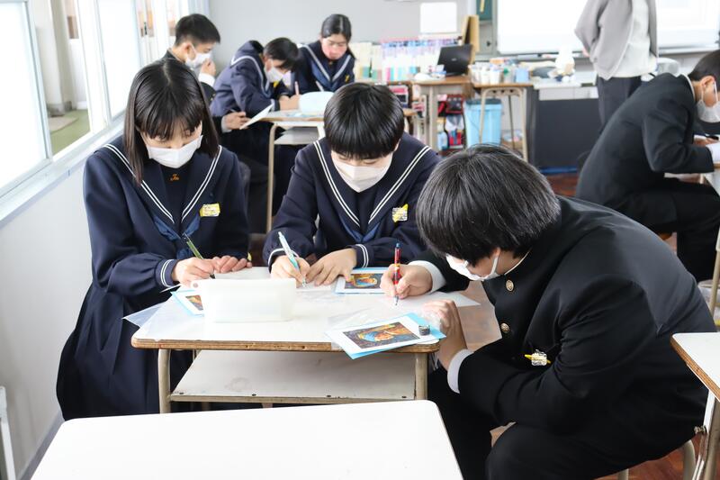 中学2年生の美術の授業です。今日は、絵画を鑑賞します。