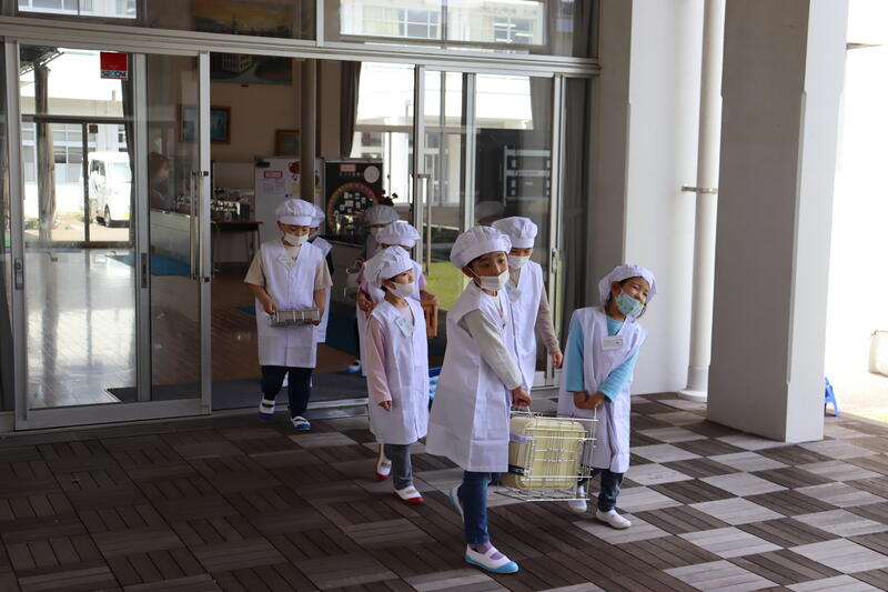 歓迎会の後は、小学1年生はじめての給食でした!手洗いもしっかりとでき、エプロンも上手に着ることができました。