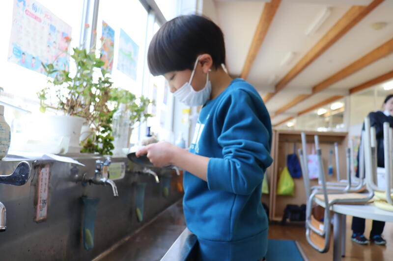 小学3年生は、理科で重さの実験をしていました。 なかよく譲り合い、やさしい3年生です。