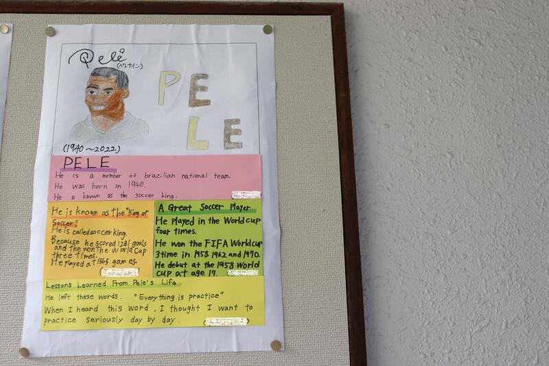 階段の掲示板に、中学2年生が書いた歴史上の著名人を英語で紹介する作品が掲示してありました。イラスト、似ていますね!英文も上手です。