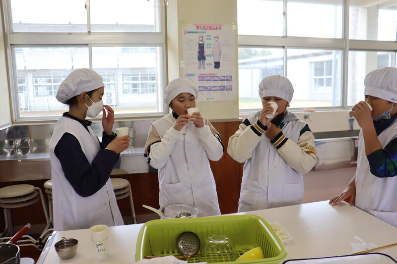 今日は5年生が調理実習でみそ汁を作っていました。みそをお湯で溶いたものと、だしで溶いたもの、両方を飲み比べています。だしのうまみがしっかり感じられました!