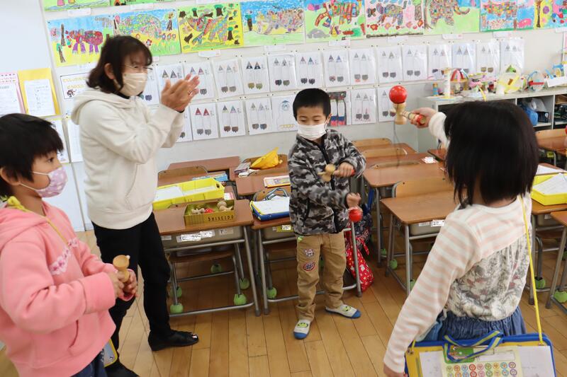 小学1年生は、今日は昔遊びを体験する日です。あやとり、お手玉、めんこ、竹とんぼ、竹馬、はねつき、こままわしなど、昔の子どもたちが親しんでいた遊びを楽しみました。