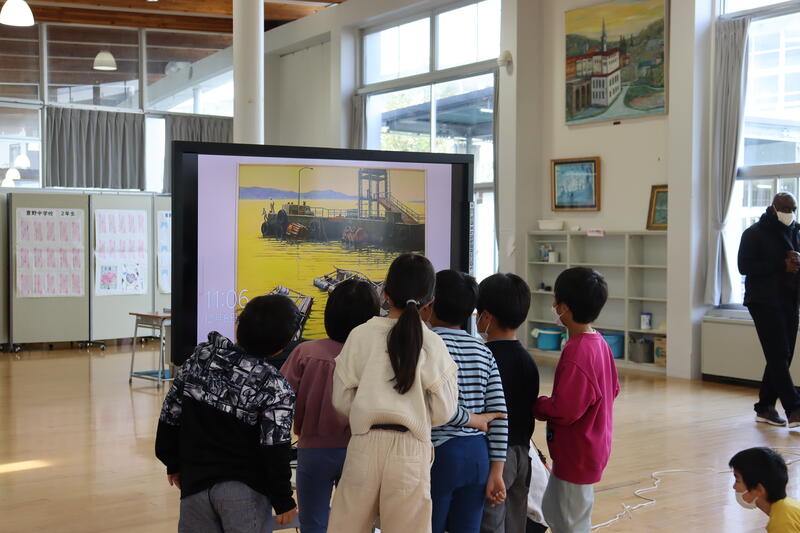 今日は、不知火美術館から、「不知火美術館コレクション+とびだすプロジェクト」と題して、絵画鑑賞の出前講座に来てくださいました。1~2時間目は小学1年生、3~4時間目は小学2年生が参加しました。特別ゲストは、アーティストの野村 誠さんです。鍵盤ハーモニカをいろいろな奏法で演奏してくださいました!