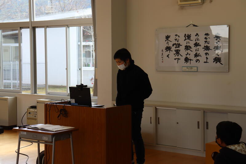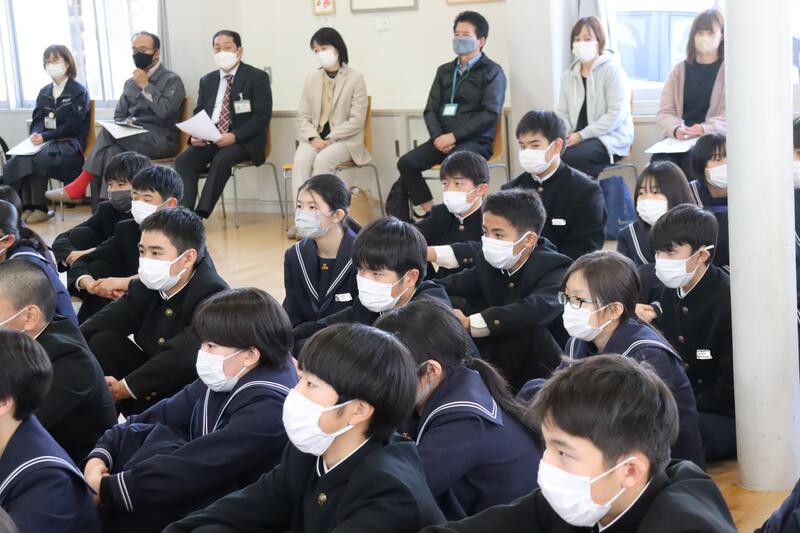 中学2年生は、岡村先生の旅行体験談をわくわくしながら聞いていました。