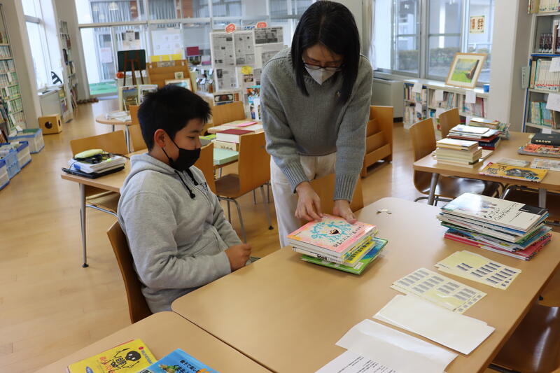 図書館のバーコード貼りに、今日もお手伝いに来てくださっています。子どもたちも手伝いに来てくれました!