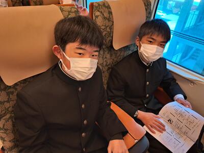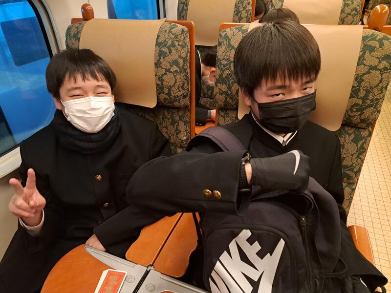 熊本駅から新幹線に乗りました。同じ車両に、他の中学校の生徒さんも修学旅行で乗っていました。