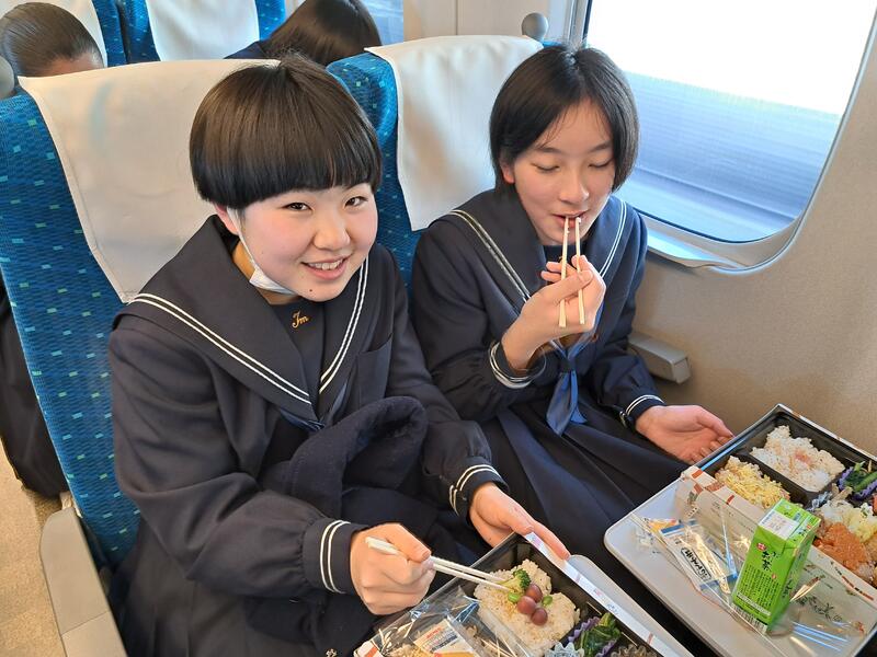 新幹線の中でお弁当を食べました。この車両でも、他の修学旅行生と一緒でした。