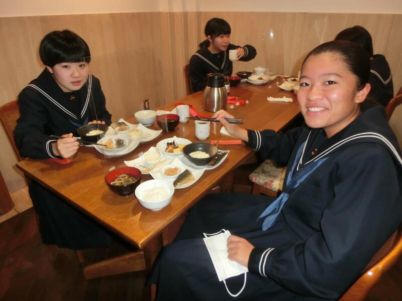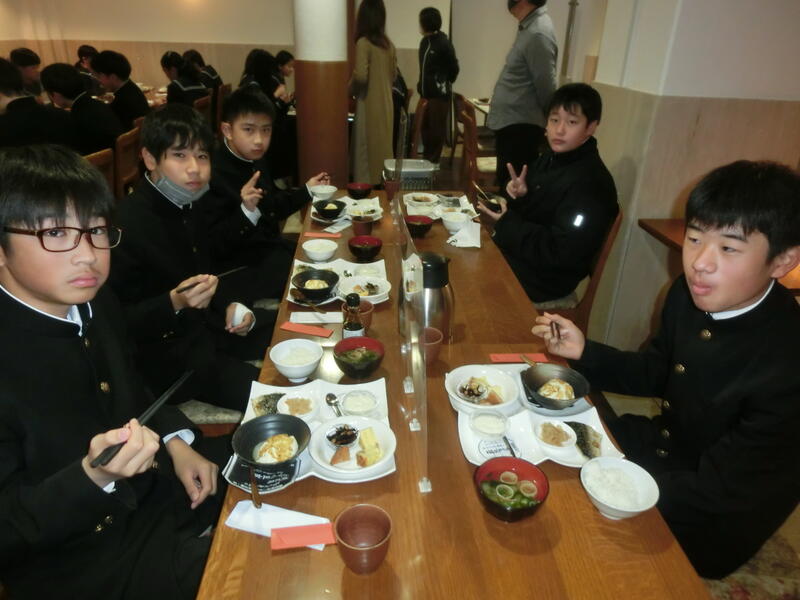修学旅行2日目の朝の様子です。みんな元気です。朝食に京都名物のお豆腐を出していただきました。おいしかったです。
