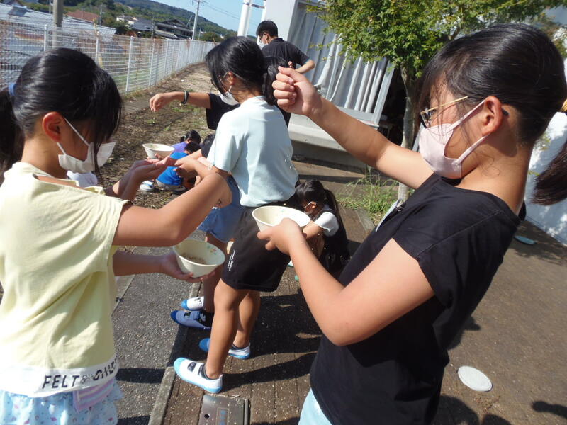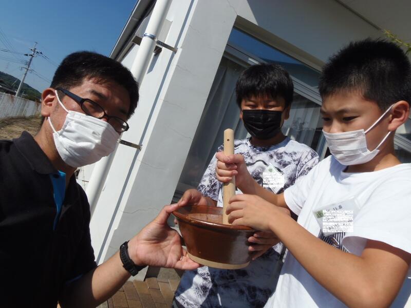 小学5年生 バケツ稲を収穫して、すり鉢で「脱穀」をしていました。楽しそうです!