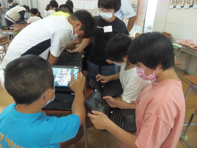 こちらは修学旅行のまとめをしていました。タブレットPCで撮った写真をグループで共有しています。