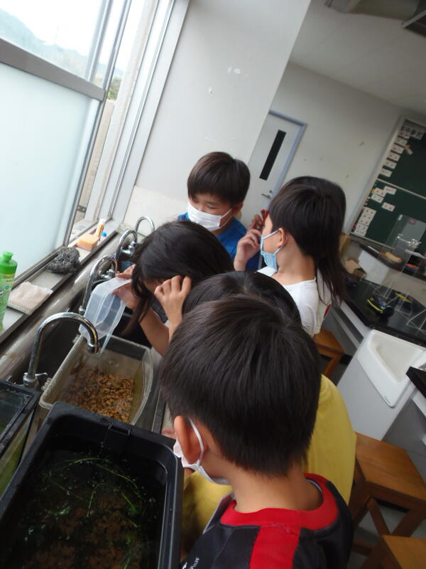 理科室のメダカが、水槽から飛び出して、瓶の中を泳いでいます!上田先生のお話だと、この様子を見るチャンスは、今の時期だと朝が多いのだとか。夜から朝にかけて水温が下がるので、少し水温の高い瓶の中に上がってくるのだそうです。みなさん、ぜひ、見に来てください。