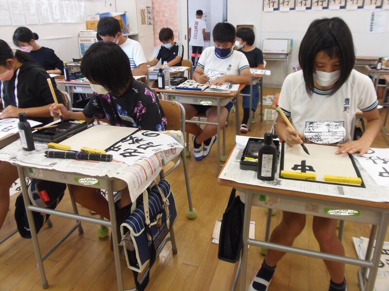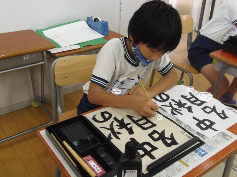 毛筆で「中秋の名月」と書いています。半紙に5文字、文字の配置やバランスが難しいですね。みんな、真剣に書いています。