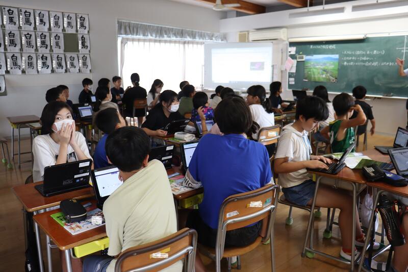 小学5年生もタブレットPCを使って社会の学習をしていました。タブレットPCに配付されたシートに書き込んだり考えを交流したりするなど、どんどんスキルアップしています。