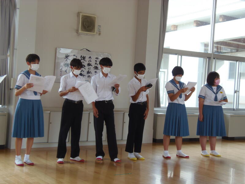 こちらは中学生、生徒総会のリハーサルです。議長、生徒会執行部、総務委員、関係委員会委員長で打ち合わせを行いました。