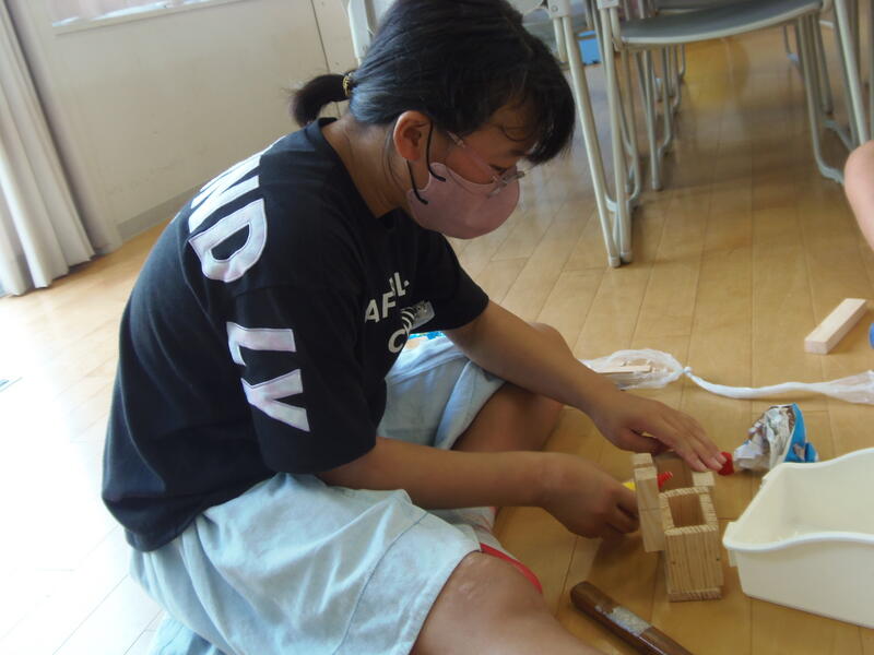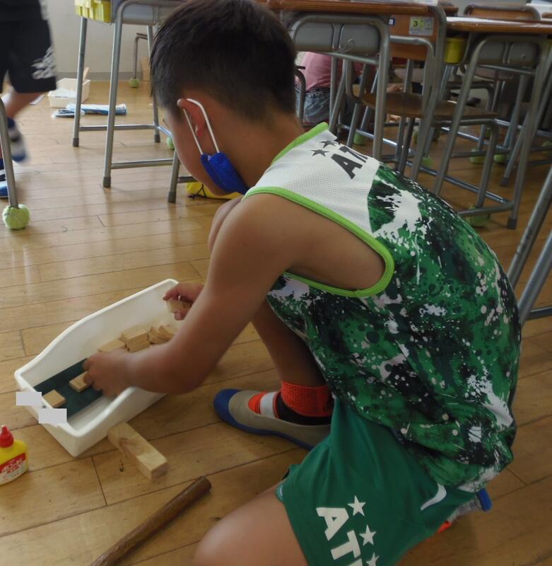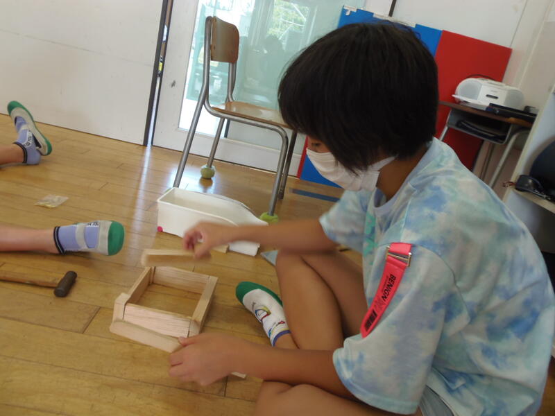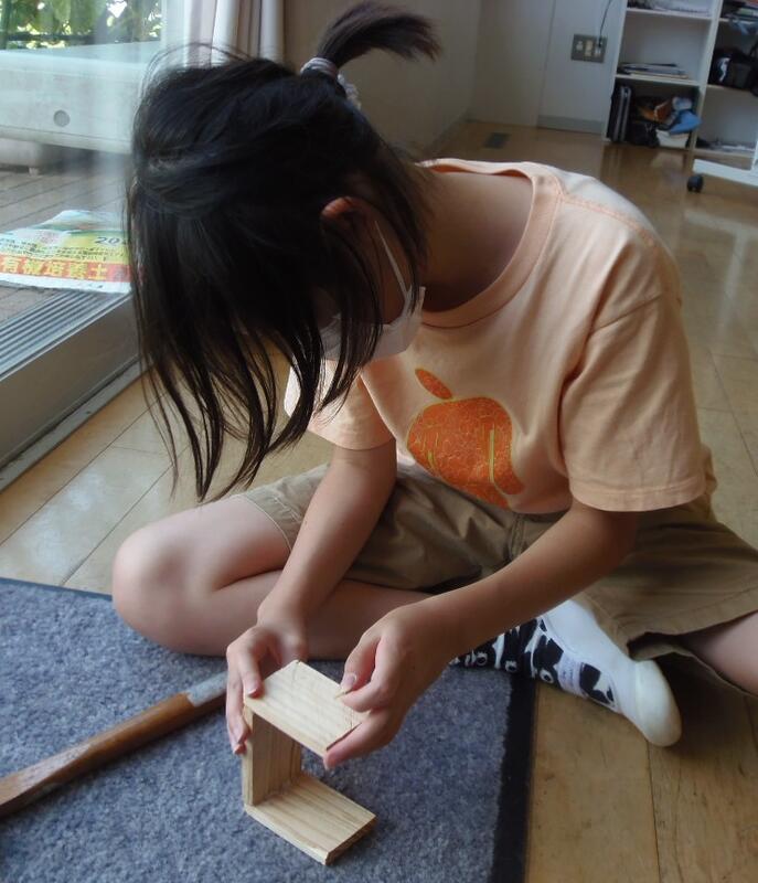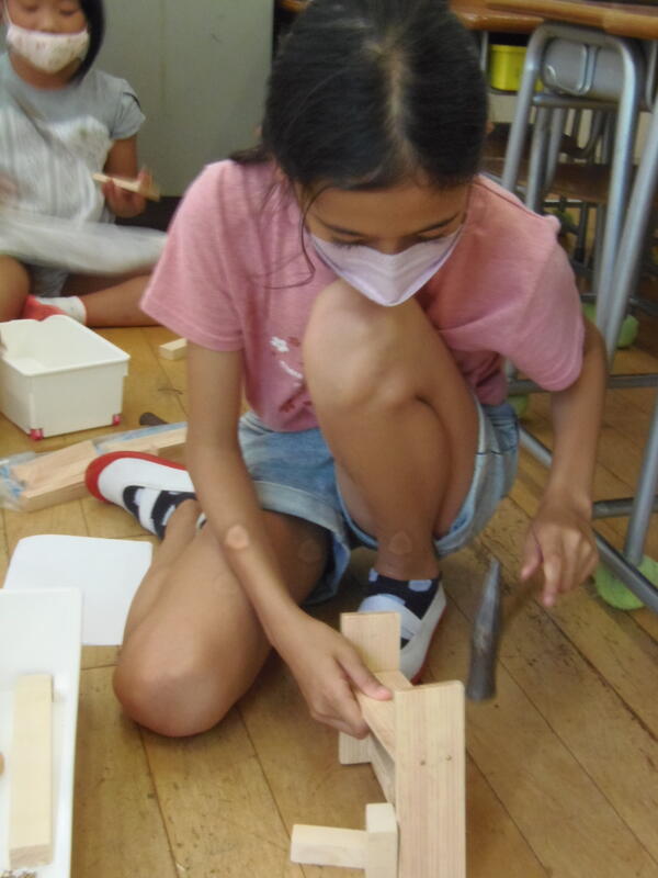 金づちとくぎを使って木片をつないでいきます。けがをしないように、慎重に作業をしていました!おもしろい形ができていました!