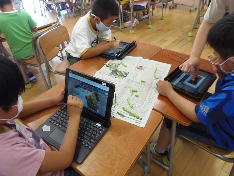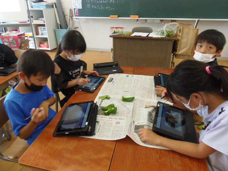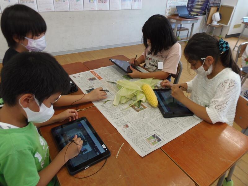 とうもろこし、ピーマン、きゅうりなど、旬のたべものをタブレットPCで撮影し、気づきを書き込んでいます。