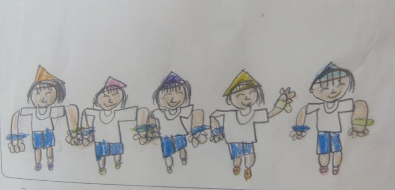 外国語の授業で、動物や虫に扮して仲間を探しながらじゃんけんをしているようです。