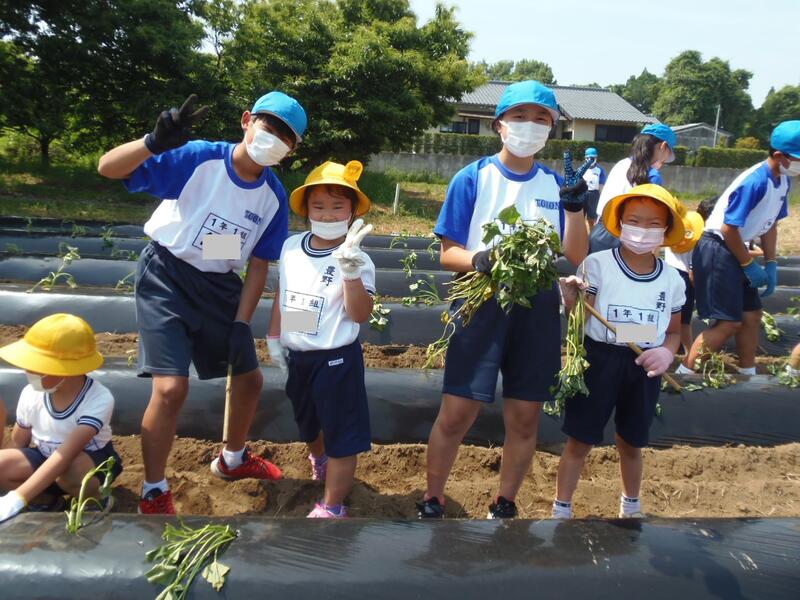 今日は、小学1年生、小学2年生、中学1年生の3学年合同でいもの苗植えをしました。