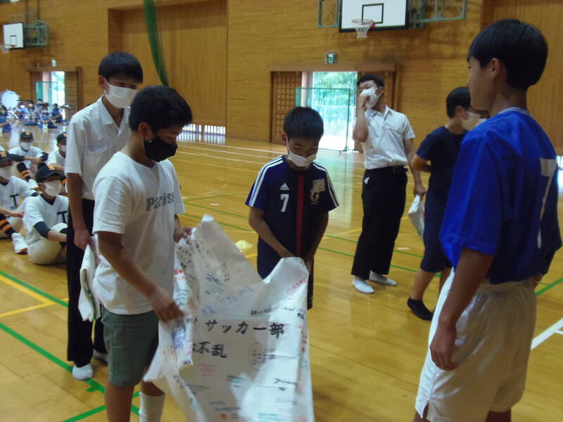 それぞれの部の応援旗に、小学生も中学生もそれぞれ応援のメッセージを書き込んでいます。