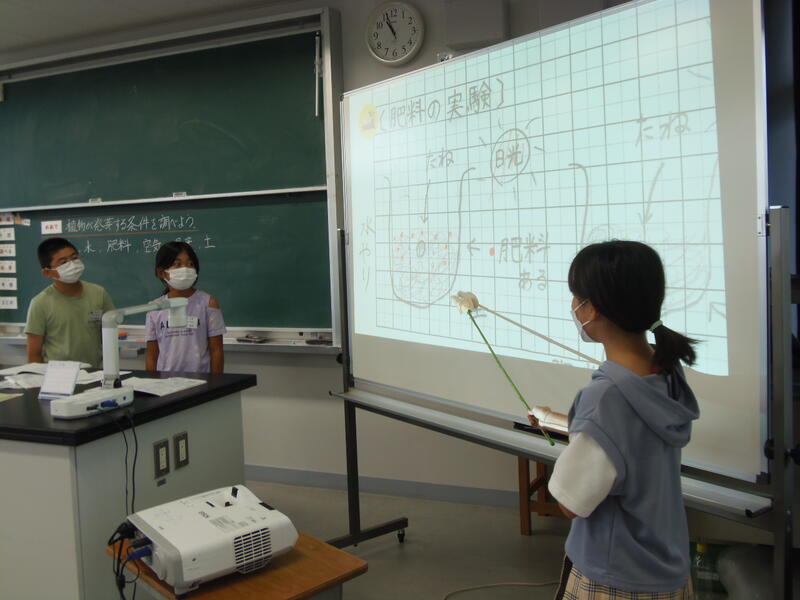 自分のノートをスクリーンに映しながら上手に説明しています。