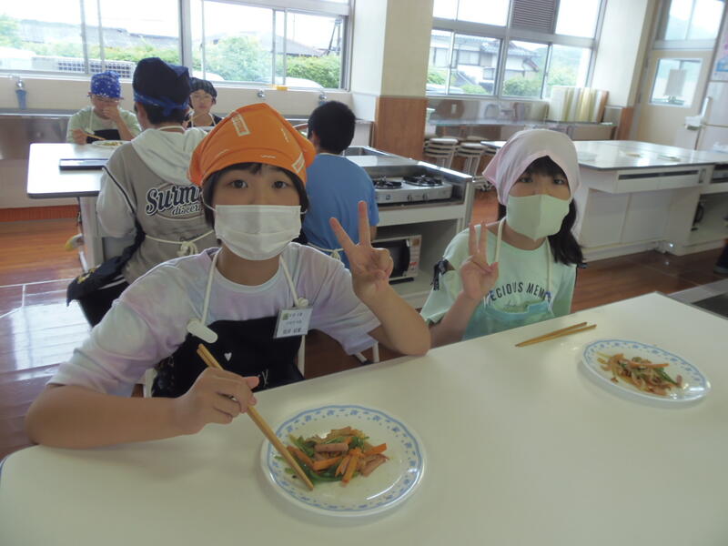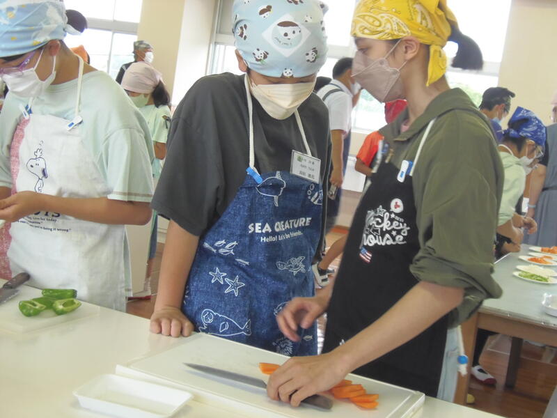 今日は6年生が調理実習をしていました。今日のメニューはスクランブルエッグ、パン、きゅうりとトマトの盛り合わせです。一人ずつ、自分の分を調理しました。友達が応援してくれています。