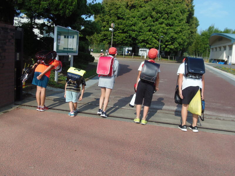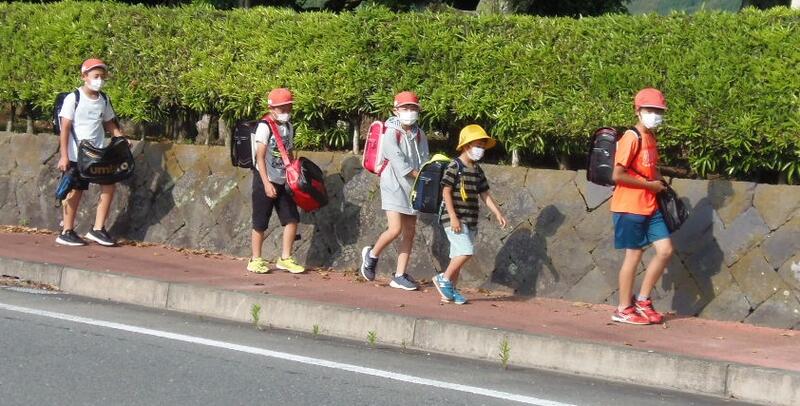 小学生は集団登校です。高学年が低学年を優しく連れてきていますね。