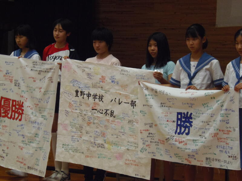 それぞれの部の応援旗に、小学生も中学生もそれぞれ応援のメッセージを書き込んでいます。
