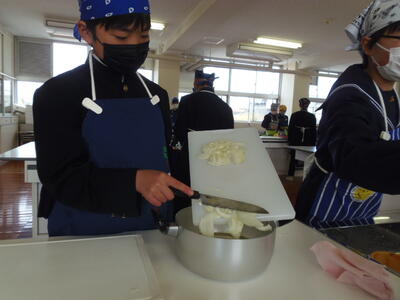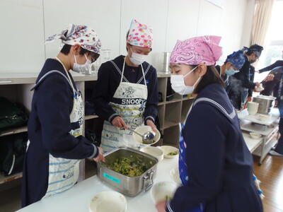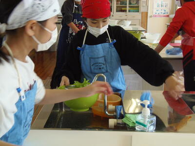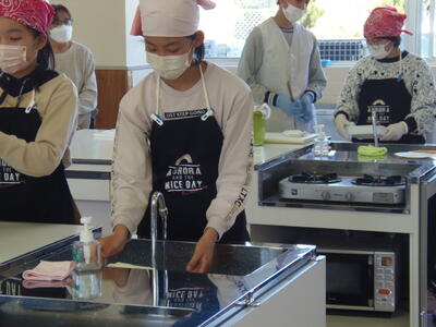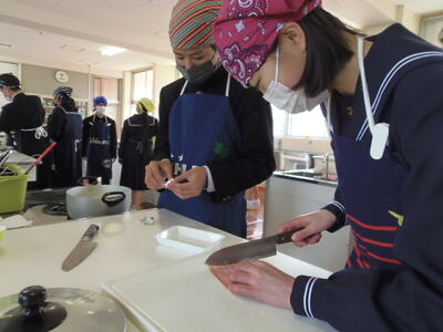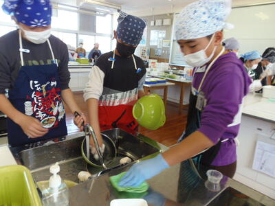 中学1年生は、家庭科の時間でした。班で協力して、スープを作っていました。包丁の使い方も上手で日頃からご家庭でも使っているのかなと感じました。