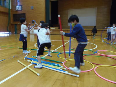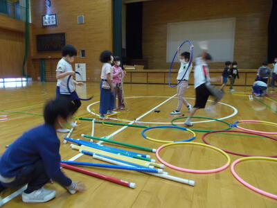 小学1年生は、図工の時間で、体育館の道具を使い、班でいろいろなものを作成しました。