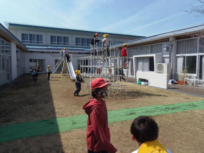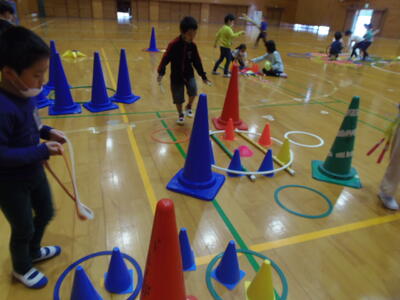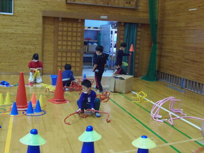 小学1年生は、図工の時間で、体育館の道具を使い、班でいろいろなものを作成しました。