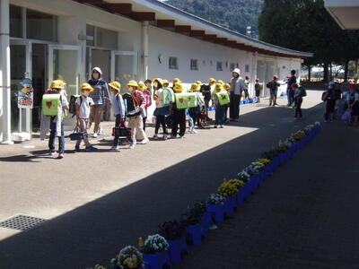 クラスマッチの写真を撮り、体育館を出たところで、小学1年生が、下校の準備をしていました。