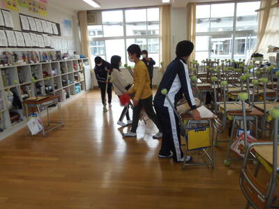 縦割り班で、1年生から3年生が入り混じって掃除をします。