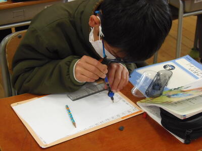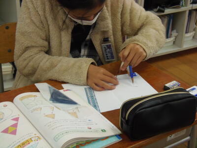 担任の先生の説明を聞いて、二等辺三角形の作図に挑戦していました。