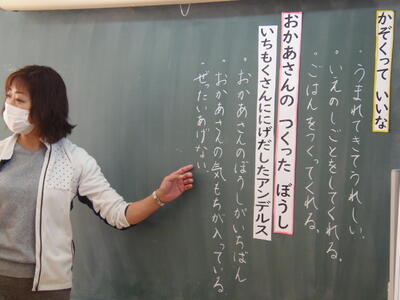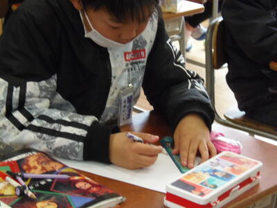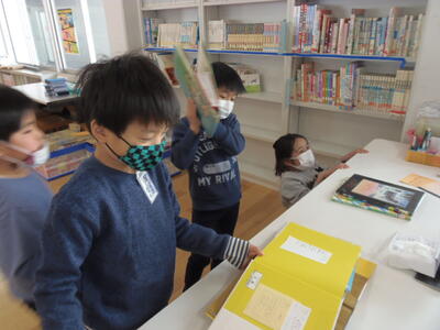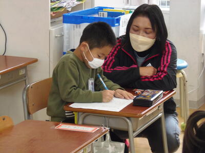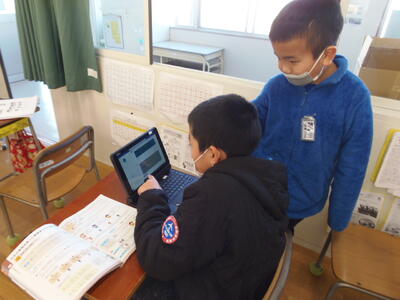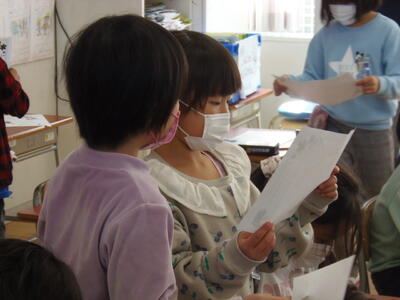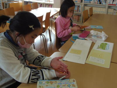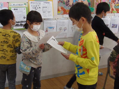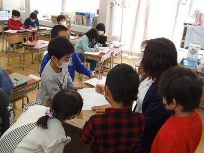 1年生は、国語の時間で「小学校の事を紹介しよう」という内容で、この一年間を振り返り作文を書いていました。早くでき児童は、担任の先生からチェックを受けて、いいものを仕上げようと頑張っていました。