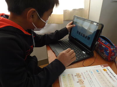 音楽室からリモートで先生からの指示を受けて、タブレットのピアノの機能を使い、旋律を確認していました。