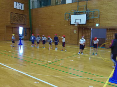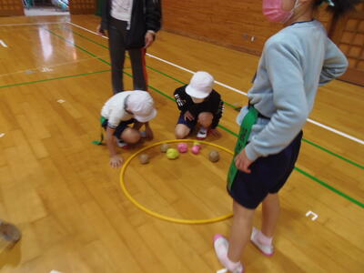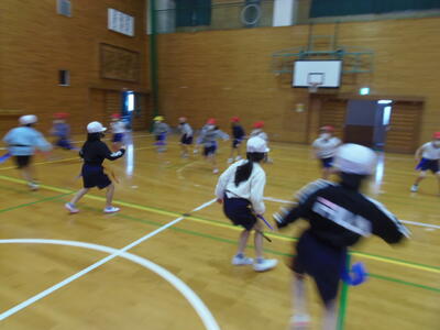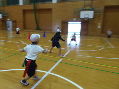 写真は、宝とり鬼ごっこです。タグをとられないように進み、宝ものをたくさんゲットすることができました。