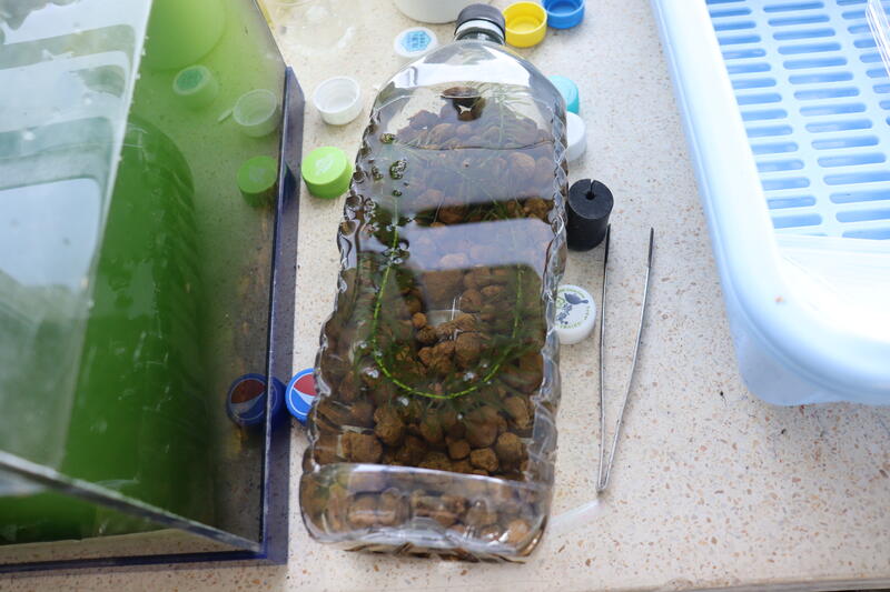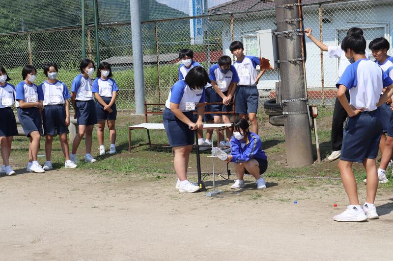 中学1年生は、「サバイバル水移し」にチャレンジしました。紙、おたま、フリスビー、ビニール袋などなど、さまざまなものを使って水を運び、ペットボトルに移します。ペットボトルに水がたくさん入ったチームの勝ちです。みんな工夫して運んでいました。慎重なタイプと思い切りのよいタイプがいて、大変盛り上がりました。