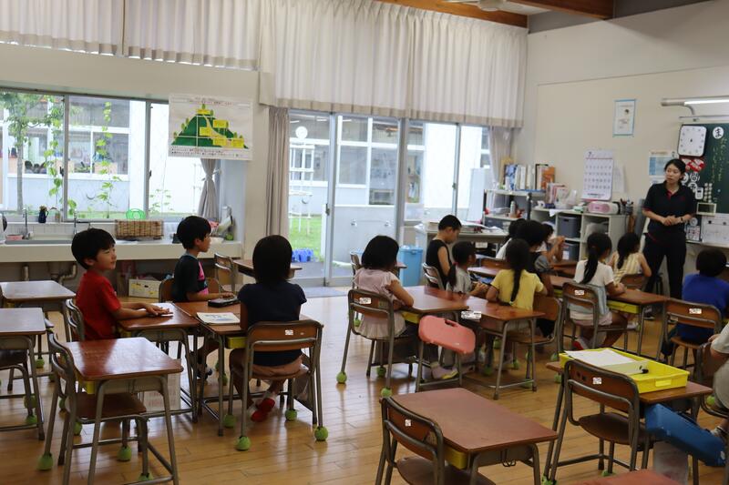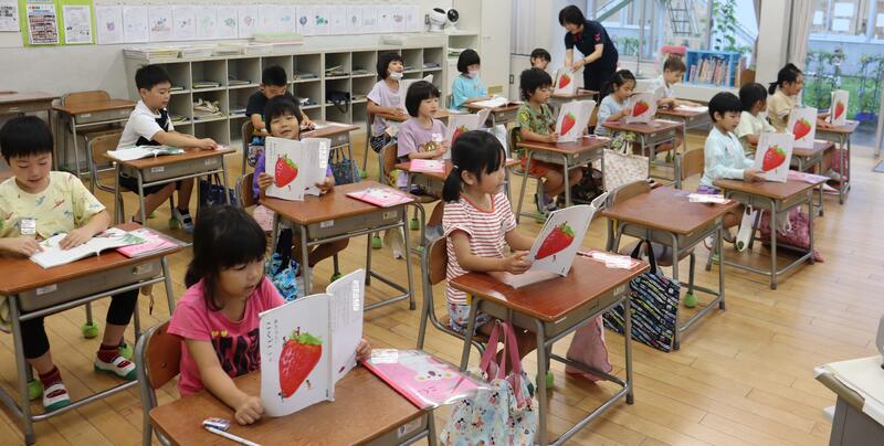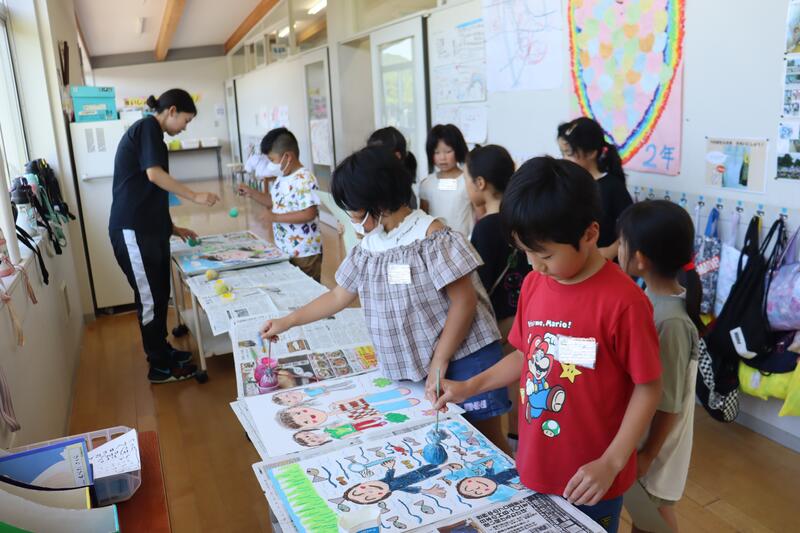 さて、1年生は図工で、画用紙をいろいろな形に切り、何に見えるか、その形をなにかに見立てながら、色を塗っていました。「わあ、おふねだ!」「すいかだ!」と、とても楽しそうです。