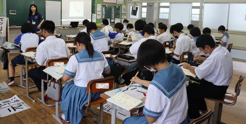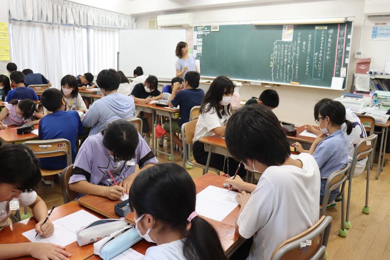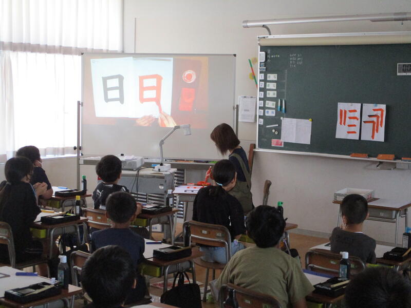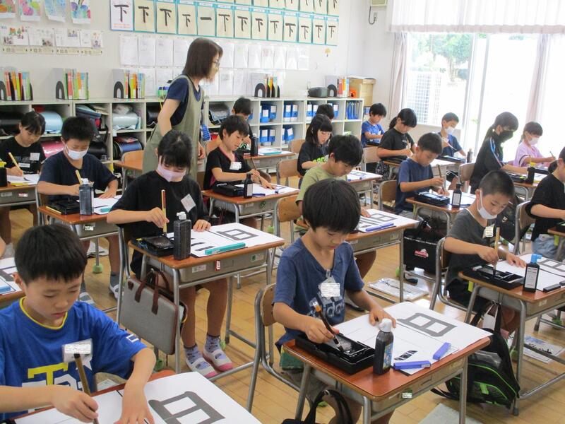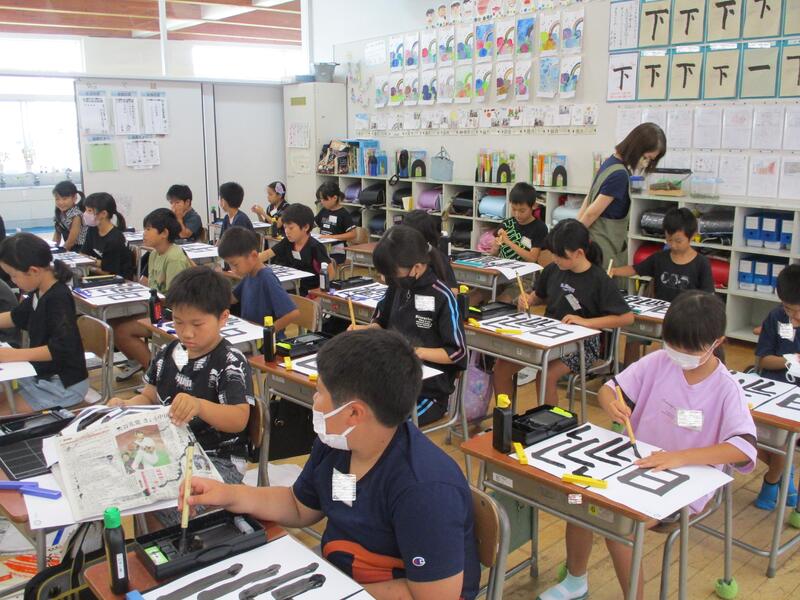 今日は、小学3年生は書写で毛筆の学習をしました。地域の習字の先生がゲストティーチャーで来てくださるので、とてもありがたいです。みんな毎回、「もっと書きたい!」と、意欲満々です。今日は「人」という字を書きました。右払いに苦労したようですが、みるみる上手になっていきました。