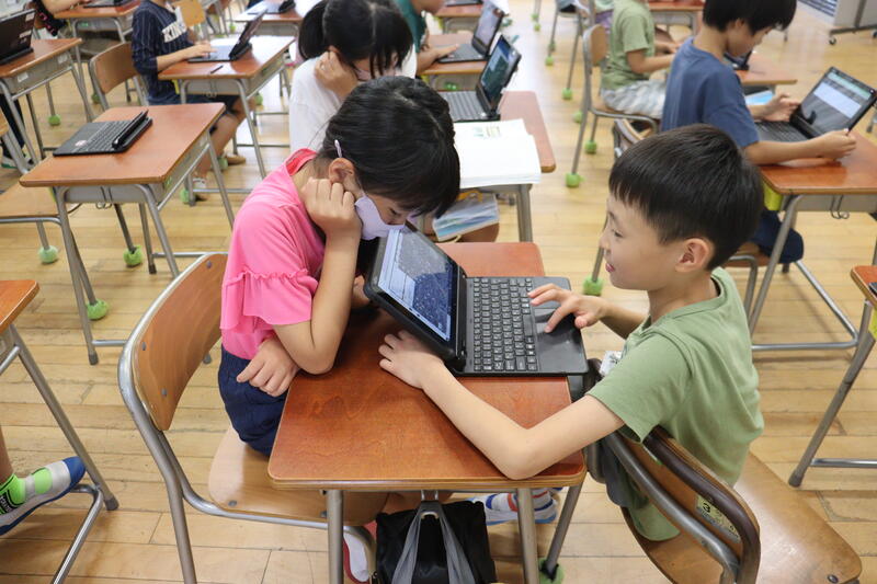 小学5年生はタブレットを使って、雲の観察をしていました。この日はどんより曇りで、「空が灰色」でした。
