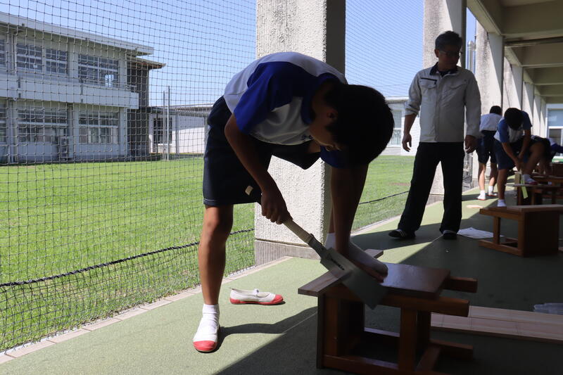 中3の生徒たちが作ったベンチで休憩中です。とても素敵なベンチです。