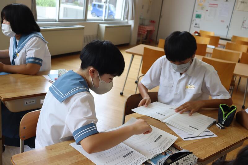 中学2年生は、図書室で国語の学習をしていました。場所を変えて、新鮮な気持ちで学習に臨んでいます。